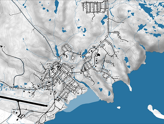 Le développement en grappe contourne les reliefs imposants suivant ainsi la loi du moindre effort. L'exemple de Kujjuuaq démontre bien les impacts d’un développement d’urgence, qui s'étend rapidement sur un seul type de sol.